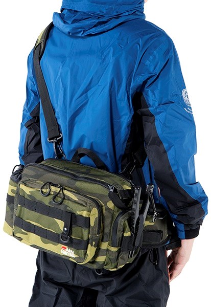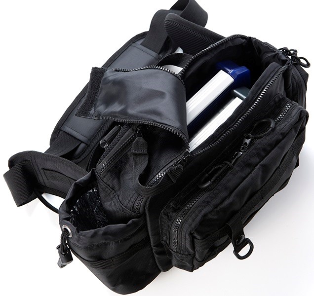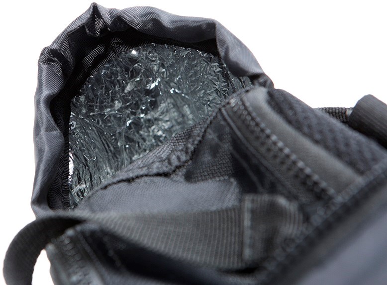 Large Hip Bag obsahuje velkou hlavní kapsu, uvnitř hlavní kapsy se nachazí síťovaná kapsa rozdělená na dvě půlky. Celá hlavní kapsa je uzaviratelná zipem. Záda tašky jsou vysoce polstrovaná a drží celou formu tašky. Na spodní části se nachází menší kapsa, ve které najdete ochranou pláštěnku z voděodolného materiálu. Po bocích tašky je nacházejí dvě kapsy, jedna izotermická a druhá kaslická na zip. Na přední straně se nachází větší kapsa, která nabízí mnoho variant využití.