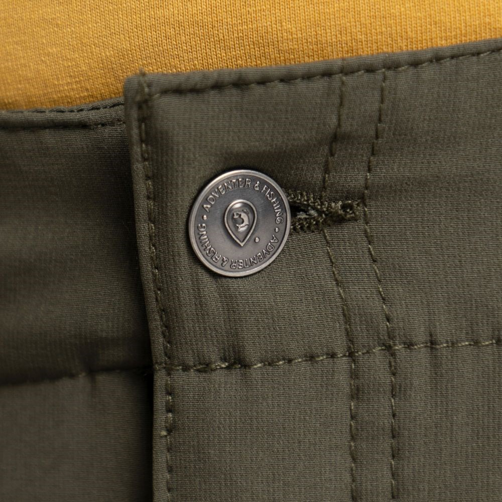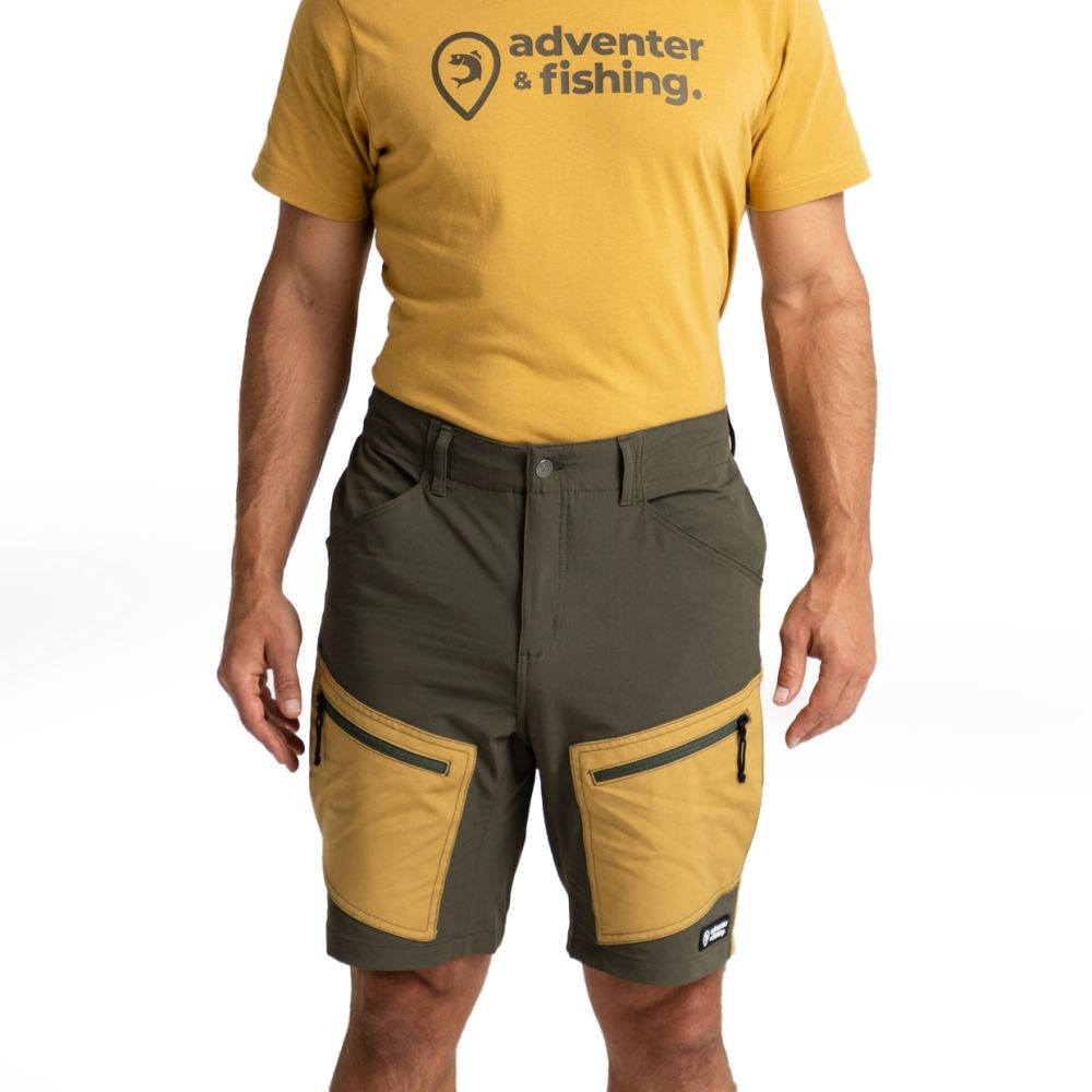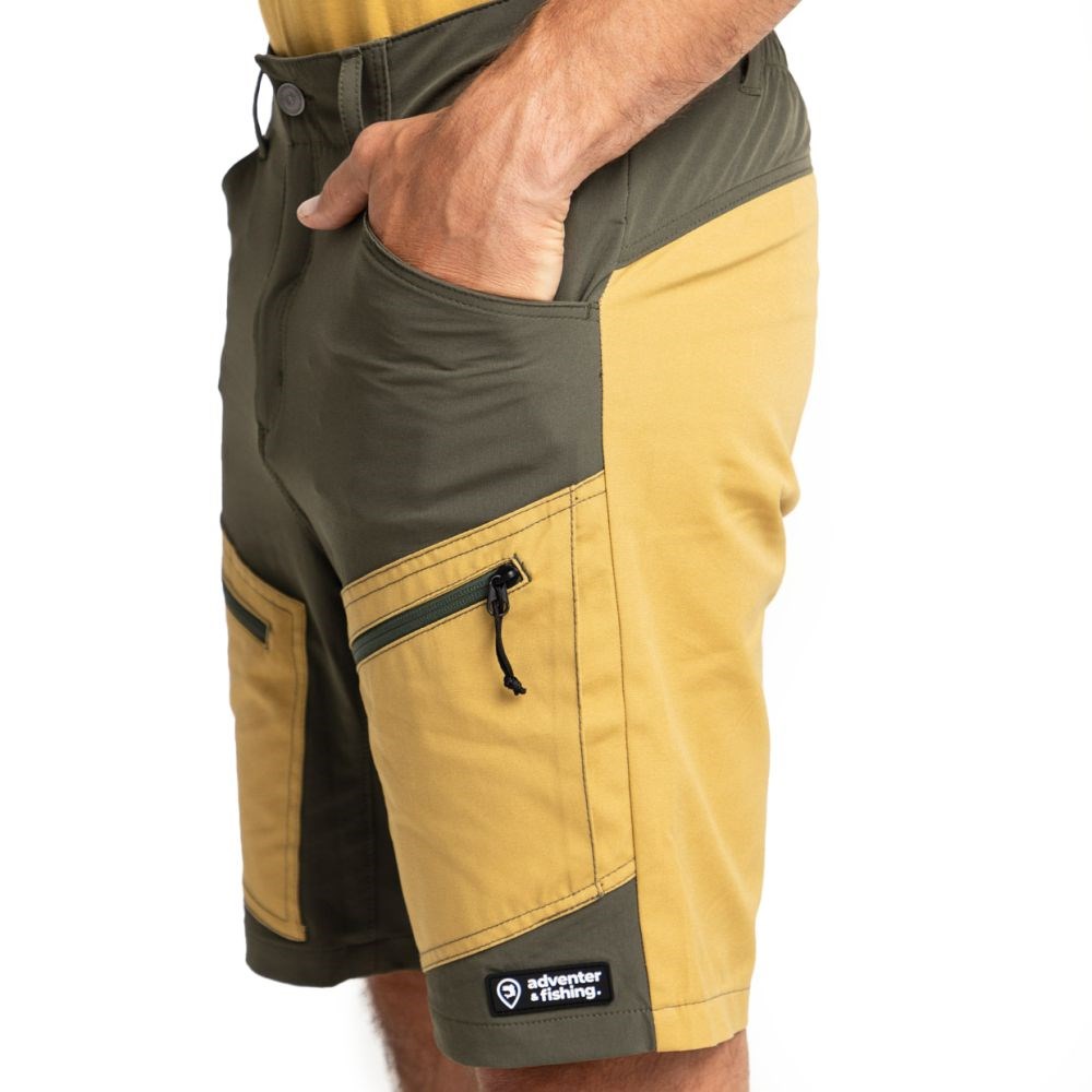 Jsou vyrobené z měkkého, jemného, poddajného a pružného materiálu, který zajistí neomezný pohyb, ať už jste na rybách nebo kdekoliv jinde. Otvor pro pásek umožní upravit pas na požadovanou velikost. Jsou vybaveny celkem čtyřmi kapsami, po dvou na přední a zadní straně šortek. Knoflík je ozdoben nápisem Adventer & fishing. Náhradní knoflík je součástí balení.