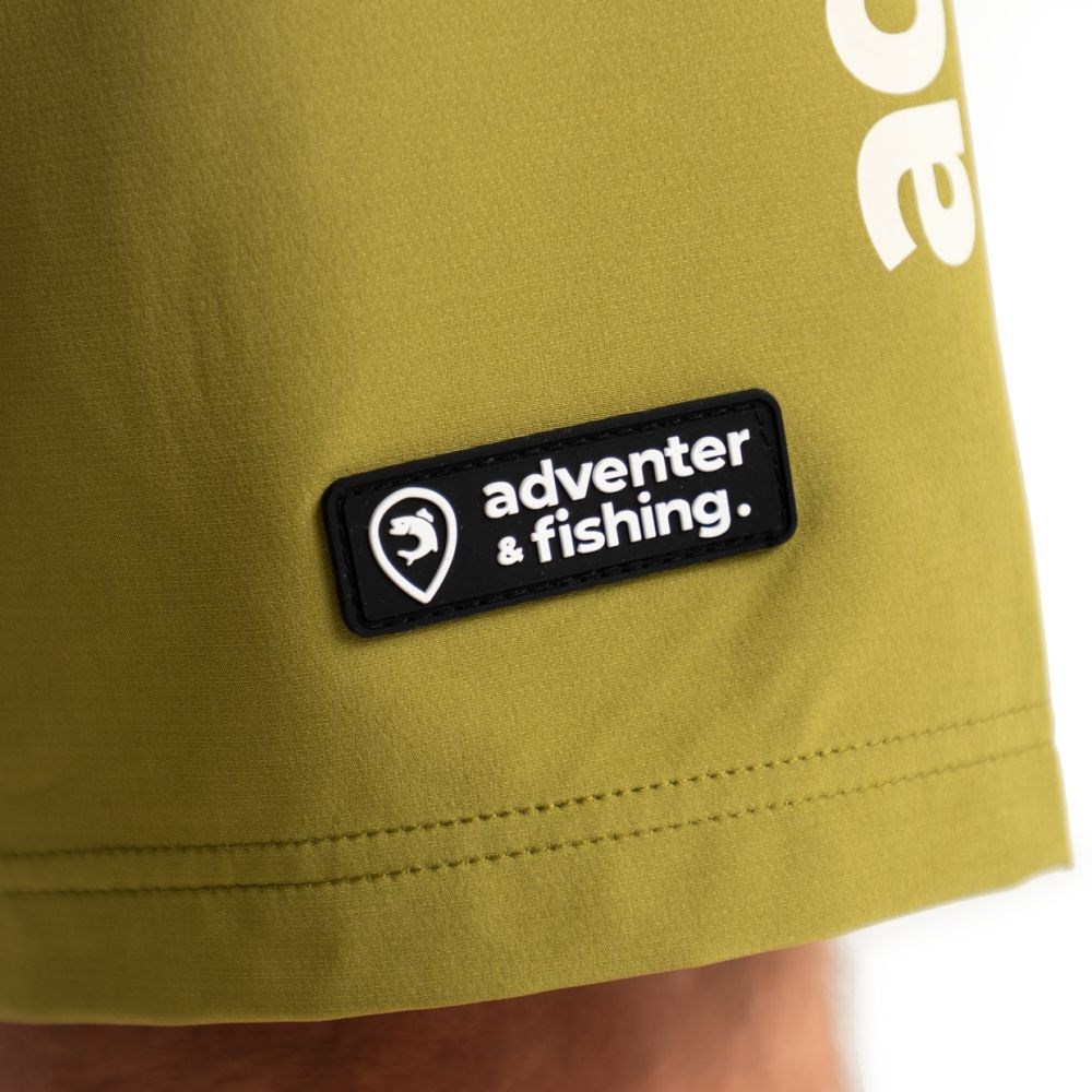 Pánské kraťasy Adventer & fishing v olivově zelené barvě Olive s bílým nápisem jsou určené především pro rybaření v teplých krajinách.