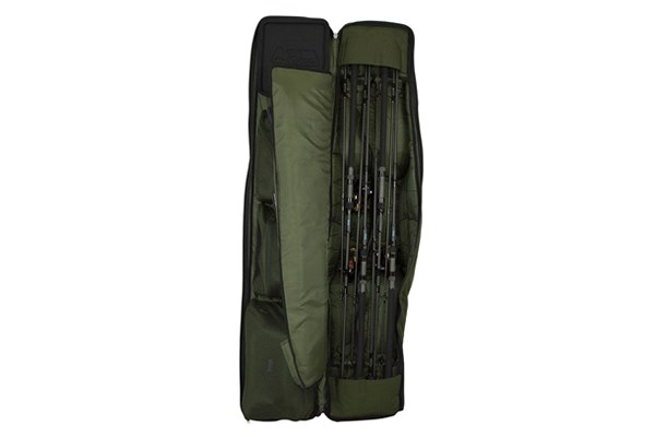 Obal je perfektně vyztužen ze zadní strany pomocí PE desky, což zaručuje maximální ochranu pro navijáky a naváděcí očka prutů. Díky svému velkému vnitřnímu prostoru tento obal bez problému pojme až 4 pruty s 50 mm naváděcími očky a velkokapacitními navijáky. Díky polstrovaným úchytům na jednotlivé pruty a velké polstrované přepážce se nemusíte bát, že by se vaše pruty nějak poškodily. Z druhé strany přepážky se nachází elastické úchyty, které slouží například na přichycení vidliček, distančních tyčí nebo kobry. Uvnitř obalu najdete tři síťovaná pouzdra například na obaly Roving Rig Pouch, Roving Buzz Bar Pouch nebo další příslušenství. Obal obsahuje odnímatelný stoleček z materiálu EVA, který může být jednoduše odepnut a používán samostatně. Hlavní výhodou pouzdra je, že máte ihned po jeho otevření snadný přístup ke všem věcem uvnitř, aniž byste museli vyndávat pruty. Na vnější straně obalu se nachází velké kapsy, které se skvěle hodí například na transport vážících saků velikosti XL, podběráku Atom nebo tyče Atom 12 m Baiting Pole. V oblasti navijáků se nachází dvě menší kapsičky na příslušenství, které se hodí například na uložení olov nebo jiného malého příslušenství, které potřebujete mít hned po ruce, když rozbalujete nebo balíte pruty. Tento skvělý obal byl doplněn o rukojeti pro jednoduchou manipulaci a pohodlným odnímatelným vypolstrovaným ramenním popruhem.