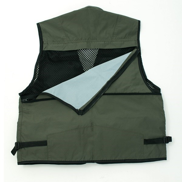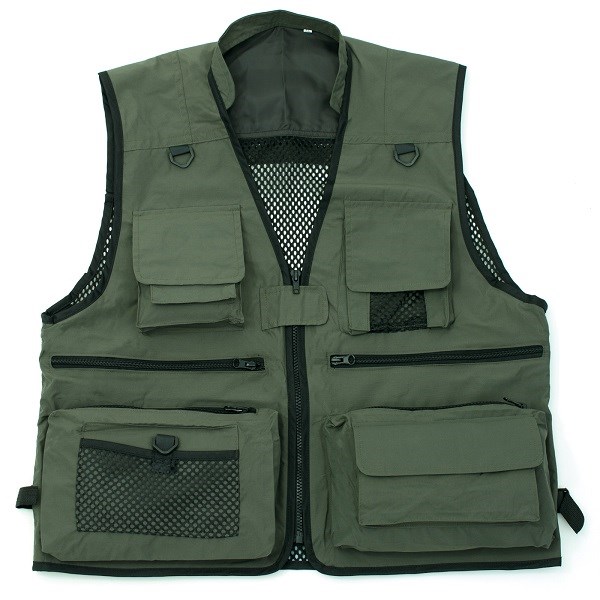 Vesta má na přední straně spoustu kapes na uschování drobností a dva D kroužky na uchycení kleští a peanu.