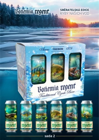 Dárkový karton Regent – Třeboňské ryby 2. ČÁST obsahuje plechovky s motivy ryb: Okoun říční, Pstruh potoční, Karas obecný, Rak říční, Lín obecný, Úhoř Říční.