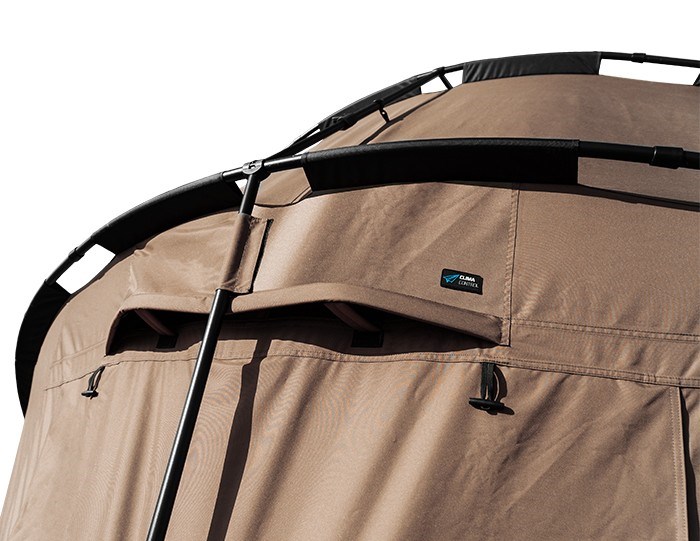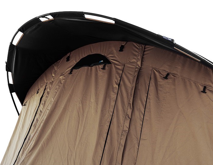 A co je na tomto bivaku opravdu revoluční? Bivak Delphin B-3 disponuje inovativním systémem CLIMA CONTROL, který byl navržený též designérským oddělením značky Delphin. Tento systém je tvořen dvěma větráky na protilehlých stranách (nad vstupními dveřmi a nad zadním oknem). Díky tomuto důmyslnému systému je možné zabezpečit přívod čerstvého vzduchu a odvod použitého v době, kdy není možné větrat bivak pomocí velkých oken. Určitě ho oceníte zejména v noci, kdy výrazně napomáhá snižovat rosení uvnitř bivaku. Celý systém je navíc jednoduše ovladatelný z vnitřku bivaku.