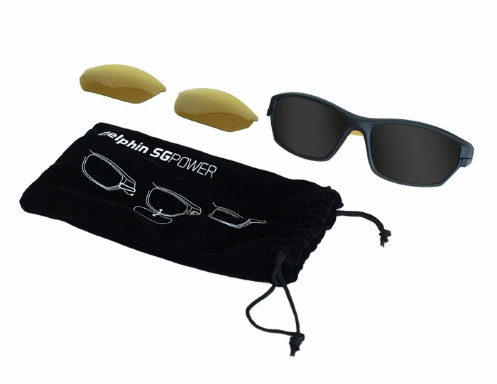 Rám brýlí je navržený na jejich jednoduchou výměnu. V úrovni ukončení ramínka se nachází pojistka, kterou zatáhnete a pootevřete rám na výměnu skel. Po výměně pojistku opět jednoduše zajistíte. Tím pádem nemusíte pro různé světelné podmínky s sebou nosit dvoje brýle. Šedé skla jsou ideální do slunečného dne s vysokou intenzitou světelných paprsků. Kromě rybaření se výborně hodí i pro řízení. Žluté skla oceníte ve zhoršených podmínkách, jako je déšť, mlha a podobně. Brýle SG POWER jsou zabalené v textilním pouzdře 18x10cm. K brýlím je možné dokoupit tvrdé pouzdro Delphin SG Case.