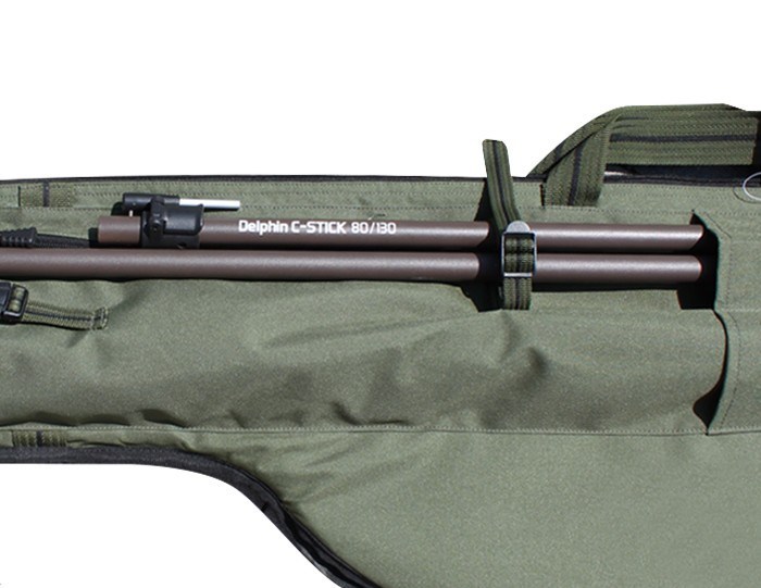 Pouzdro je plně polstrované 6mm výstelkou na každé stěně, včetně předělovací stěny. Tím pádem nehrozí při transportu 2 prutů jejich vzájemné poškození. Obě vnitřní komory na pruty jsou fixovateľné pomocí suchého zipu na jejich vrchu. Při navrhování pouzder jsme mysleli na uložení největších navijáků a dovolíme si tvrdit, že je sem možné uložit 99,9% běžně používaných kaprařských sestav, včetně těch, s očky velikosti 50mm!