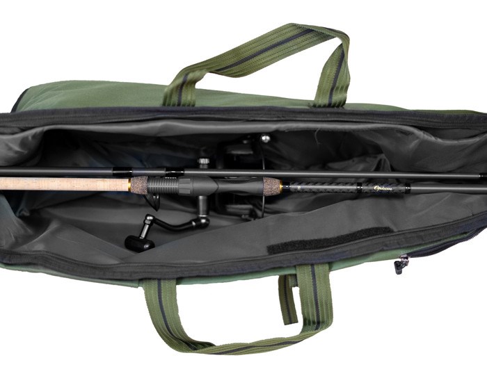 Model má po straně extra dlouhou kapsu se zipem, která slouží například pro transport rybářského podběráku. Na něm jsou našity uložení na vidličky i se stahovací páskou. Toto pouzdro tak pojme většinu těžko skladného rybářského náčiní.