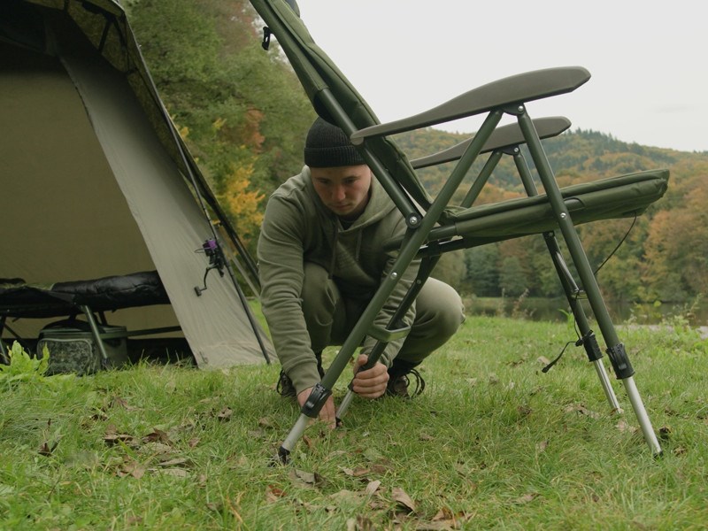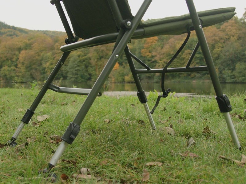Výškově nastavitelné nohy umožňují přizpůsobit křeslo nerovnému terénu a zaručují stabilitu i v náročných podmínkách. O bezpečné zajištění polohy se starají flexibilní robustní patky, jejichž velká plocha účinně zabraňuje zapadnutí nohou do měkké půdy u vody. Navíc je křeslo vybaveno plastovým klipem, který fixuje jeho polohu během převozu a předchází nechtěnému rozevírání.