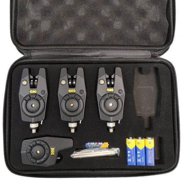 Sada obsahuje: 1x kufřík, 3x signalizátor, 1x příposlech, baterie, šňůrka na pověšení příposlechu. Signalizátory se vyznačují dlouhým dosahem – 200-220m. Pracovní teplota -10 až +70°C. Mezi další funkce patří - nastavení citlivosti, hlasitosti, tónů, individuální nastavení barev na signalizátoru, pohotovostní svítilna na příposlechu, paměťová funkce zapnutí a vypnutí signalizátoru, nastavení vibrace na příposlechu, výstup pro svítící swingry, zvukové rozlišení tahu a pádu, možnost prodloužení proti větru, příposlech lze také pověsit na ruku nebo na krk. Jednotlivé signalizátory jsou na příposlechu barevně rozlišeny. Signalizátory i příposlech jsou vyrobeny z velmi kvalitního pevného materiálu, moderního designu černé barvy.