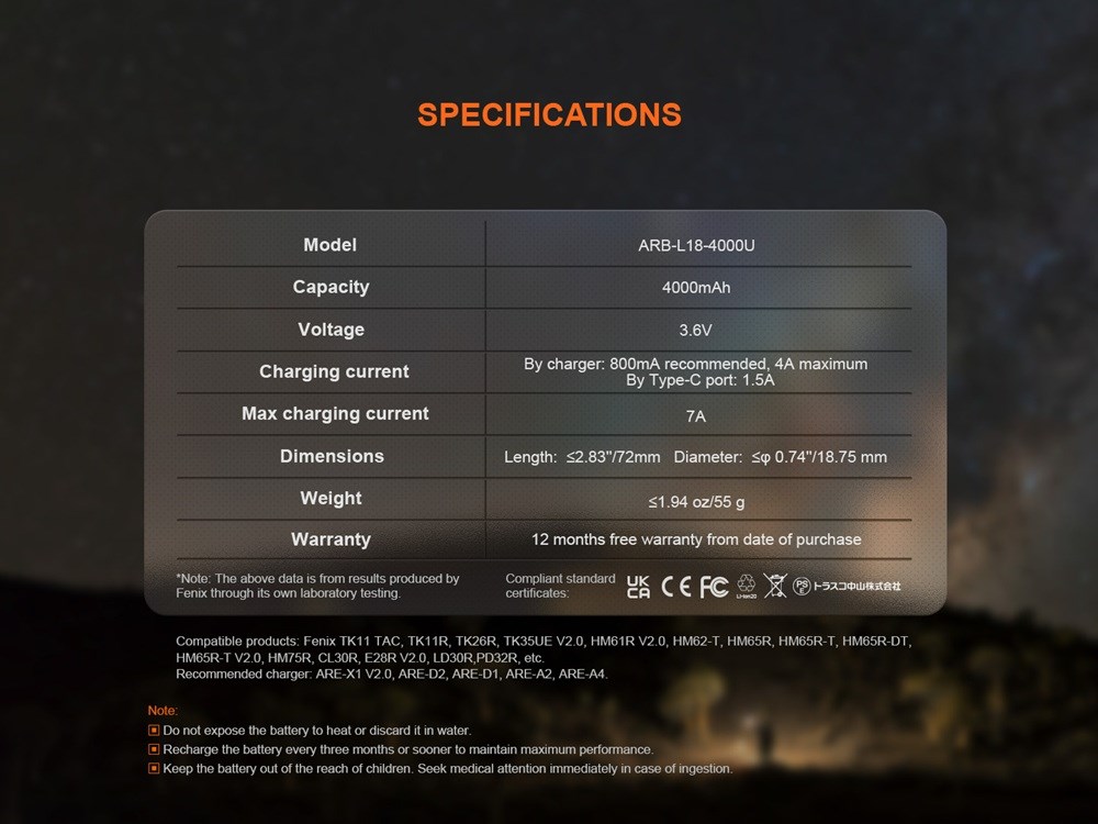 Pozor, tento akumulátor je kvůli přidanému nabíjecímu USB-C konektoru dlouhý cca 72 milimetrů, takže je výrazně delší než běžné Li-ion typu 18650. Vejde se tedy jen do některých svítilen, čelovek a nabíječek. Kompatibilitu máme ověřenou v těchto svítilnách a čelovkách Fenix: PD32R, E28R V2.0, LD30R, TK11 TAC, TK11R, TK26R, TK35 UE V2.0 (5000 lumenů), CL26R, CL30R, HM62-T, HM65R-T V2.0, HM75R, HM61R, HM61R V2.0.
