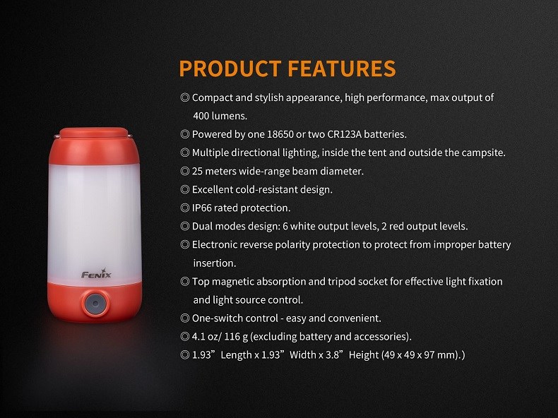 Díky odolné a nárazuvzdorné konstrukci s krytím IP66 lze svítilnu bezpečně používat i v nepříznivém počasí (silný déšť). Horní strana lucerny je opatřena závěsným okem a silným neodymovým magnetem, takže ji lze snadno zavěsit či upevnit na cokoliv železného. Možnosti upevnění dále rozšiřuje závit na stativ, který je také na horní straně lucerny. Díky kompaktním rozměrům a váze 165 gramů je lucerna vhodná zvláště pro kempování a turistiku.