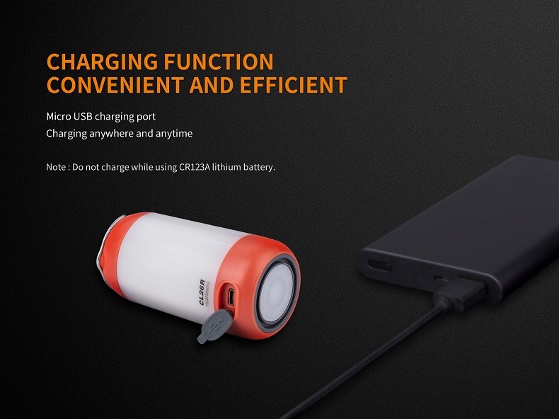 Pro nabíjení lucerny odklopte gumovou krytku micro-USB konektoru. Připojte ji pomocí přiloženého USB kabelu do počítače, síťového USB adaptéru nebo USB adaptéru do auta. K nabíjení lze použít i standardní nabíječkou na mobilní telefon s micro-USB konektorem či powerbanku. Během nabíjení blikají indikační LED nad bočním tlačítkem a ukazují průběh nabíjení. Po skončení nabíjení zůstanou svítit.