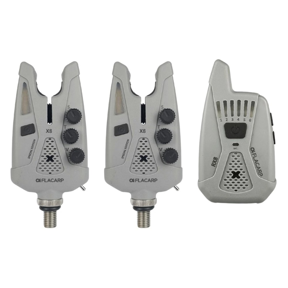 Špičkové české signalizátory záběru FLACARP X8 vycházejí z oblíbeného modelu X7 a přidávají množství užitečných funkcí. Kromě osvědčeného designu, velmi vysoké mechanické odolnosti, precizního snímače odvíjení vlasce s potahem již od 1,5mm v obou směrech a v neposlední řadě napájení běžnými tužkovými články AAA, byly přidány nové funkce: režim potlačení falešných poplachů (např. při rybolovu v nepříznivém počasí nebo ze člunu), noční poziční světlo na swingeru, širší rozsah regulace délky potahu vlasce od 1,5mm až do 30cm, vylepšený zvuk padáku pro jednoznačné rozlišení směru odvíjení vlasce, širší rozsah nastavení barev LED a další vylepšení. Kvalitní český výrobek.