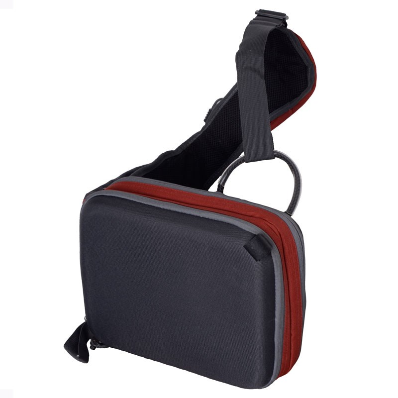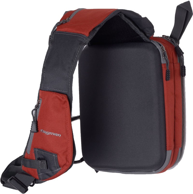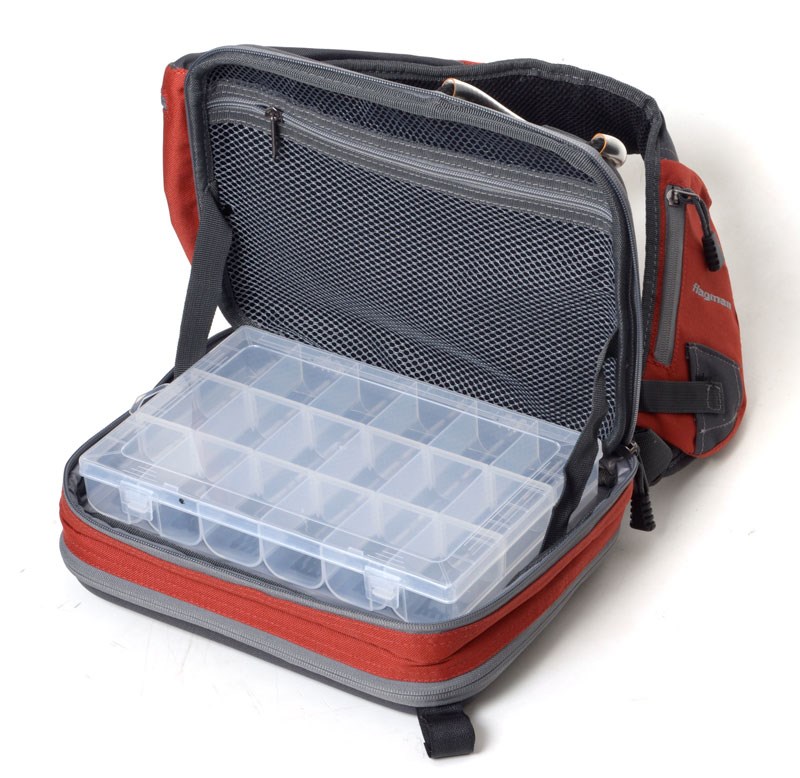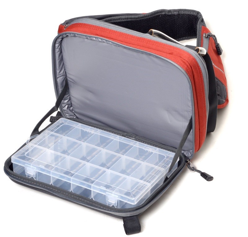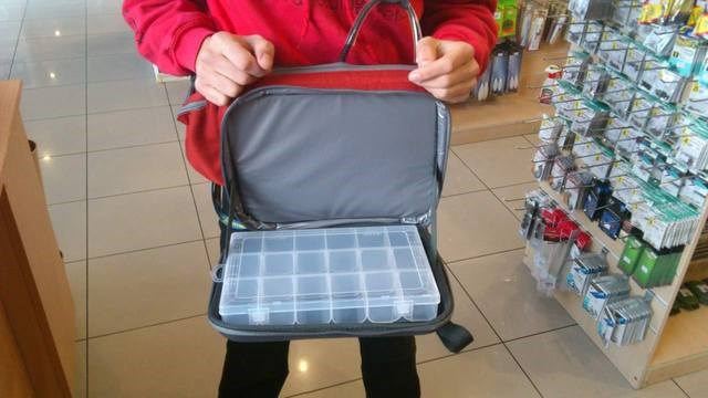 Mezi předními a zadními polotuhými kryty jsou dvě přihrádky, z nichž každá je vybavena velkou krabicí vhodnou k přepravě nástrah s délkou až 17 cm. Tyto boxy jsou součástí balení. Aby se vyloučilo převrácení, jsou pomocí suchého zipu připevněné k vnitřní ploše oddělení. Velké části krabic jsou rozděleny na menší, pomocí odnímatelných příček, což umožňuje úspěšně použít boxy na přepravu nástrah malých rozměrů. Taška je navržena takovým způsobem, že během rybolovu je hlavní komora skloněná za zády a nebrání v pohybu a pokud je to nutné, poskytne rychlý přístup do krabiček snadným otočením tašky. Kromě hlavní přihrádky je taška vybavena dvěma velkými kapsami se zipy. Jedna z nich je vybavena zevnitř nepromokavou látkou. K dispozici jsou také speciální kapsy na kleště, kde jsou upevněny pomocí suchého zipu. Síťová vnitřní krytina ramenního popruhu přispívá k odstranění vlhkosti z těla.