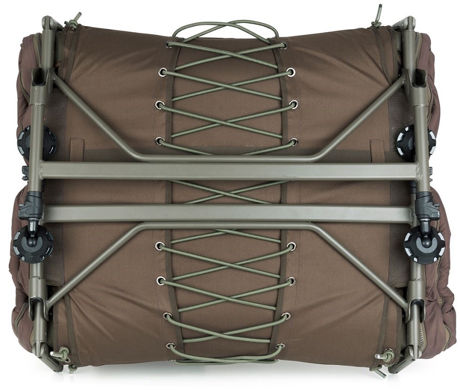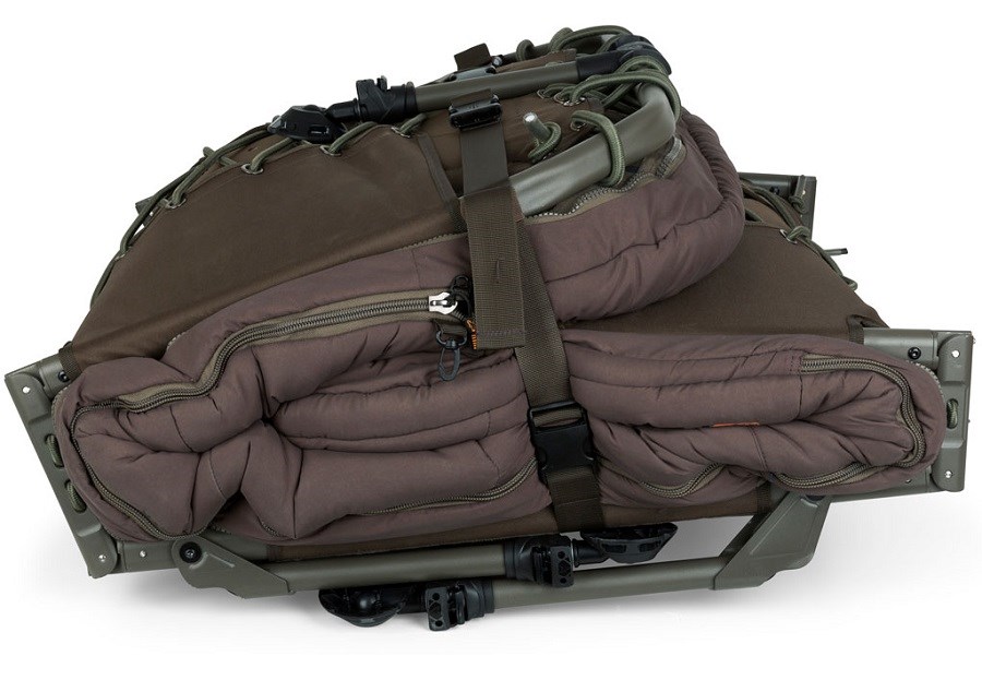 Boční stahovací popruhy (dva popruhy na každé straně, které jdou při balení kolem rámu a spacáku a ne okolo matrace) umožňují kompaktnější zabalení než klasická lehátka s jedním dlouhým popruhem
