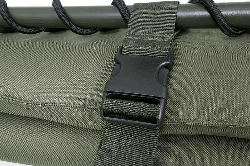 Systém popruhu a přezky umožňuje zabalení lehátka společně se spacákem