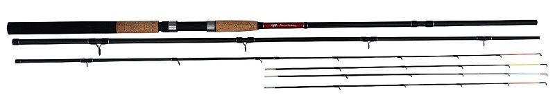Tyto feederové pruty jsou vyrobeny z kvalitního grafitu IM6 a mají středně rychlou akci. Jsou velmi univerzální, výkonné díky své parabolické akci a čtyřmi výměnnými špičkami s různou tvrdostí. Díky rozsahu nabízených špiček, jste připraveni na jakou situaci a druh lovené ryby. Souhrn špiček dodávaných k prutu: žlutá - nejtužší, oranžová - střední tuhost, červená – jemná, zelená ultra jemná. Prut je osazen kvalitními dvojitě vázanými SIC očky a má ergonomické DPS grafitové sedlo.