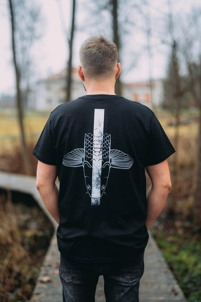 Kvalitní pánské tričko v černé barvě s naším originálním designem kapří hlavy na zádech.
