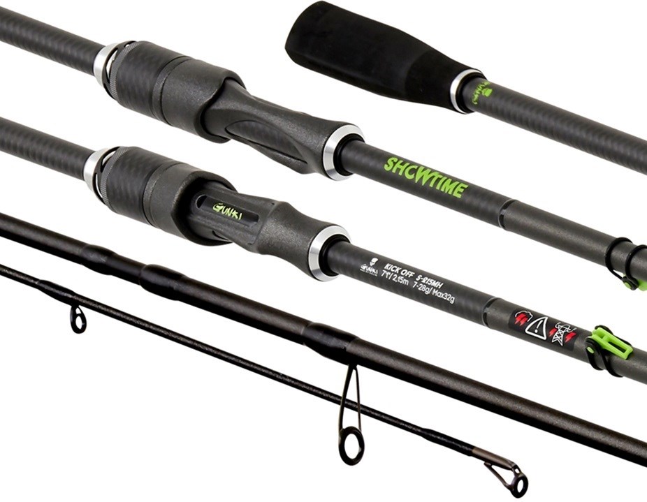Showtime Kick Off S 250M/MH: délka 250 cm, počet dílů 2, vrhací zátěž 5–25 g (max. 30 g), skladná délka 129 cm, váha 135 g, počet oček 9.