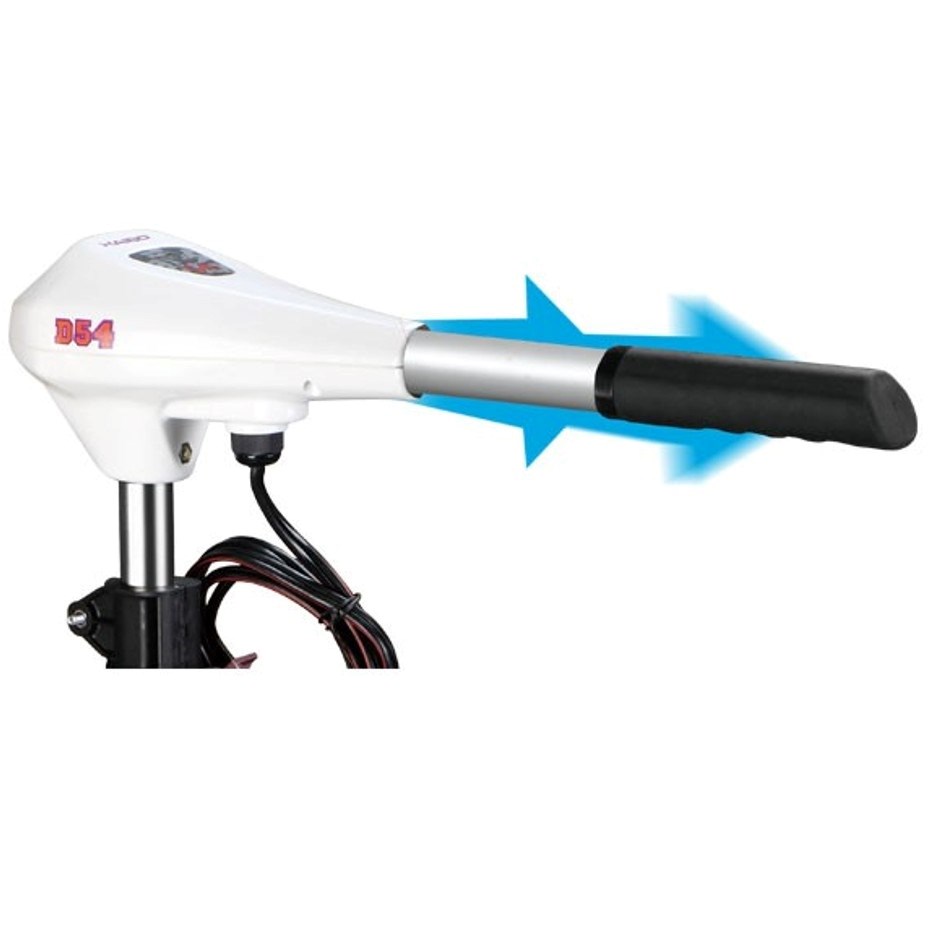 Motor se snadno ovládá, má 5 rychlostí dopředu a 3 dozadu. Je tichý a má nízkou spotřebu. Při úsporném ježdění vydržíte jezdit i 5 – 7 dní na jednu 100 A baterii, samozřejmě, při vyšším zatížení (vlny, delší vzdálenosti,…) ji vybijete za 2 až 4 dny. D54 má výborné zpracování, silnou třílistou vrtuli z pevného plastu (součástí balení je druhá náhradní vrtule!), nerezovou nohu o délce 91 cm, antikorozní úpravu, výsuvnou rukojeť a digitální číslicový displej, který informuje o stavu baterií. Na přívodním kabelu je umístěna přepěťová ochrana.