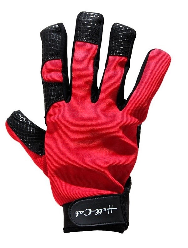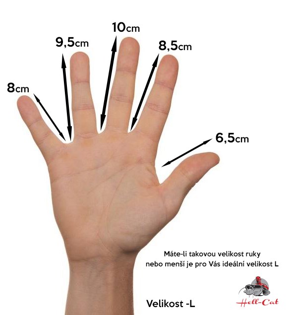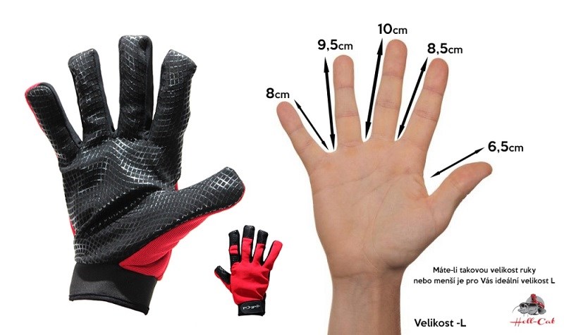 Dlaň je vyrobena se silikonovým protiskluzovým potiskem. Na vrchní straně rukavic je použitý materiál Spandex, který je elastický a prodyšný. Konec rukavice je pak zakončen manžetou, která je opatřena suchým zipem. Rukavice jsou maximálně odolné a agresivní design mluví za všechno. Prostě Hell-Cat!