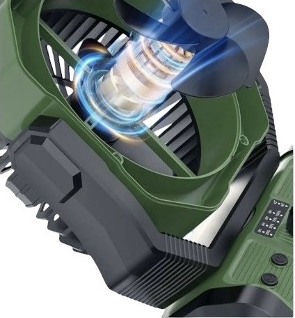 Obrovská baterie s kapacitou 20 000 mAh zajišťuje dlouhou výdrž a zároveň slouží i jako powerbanka, takže si na cestách dobijete telefon nebo jiná zařízení. Nechybí ani plynulá regulace otáček, indikátor stavu baterie či možnost vložení tablety proti hmyzu.