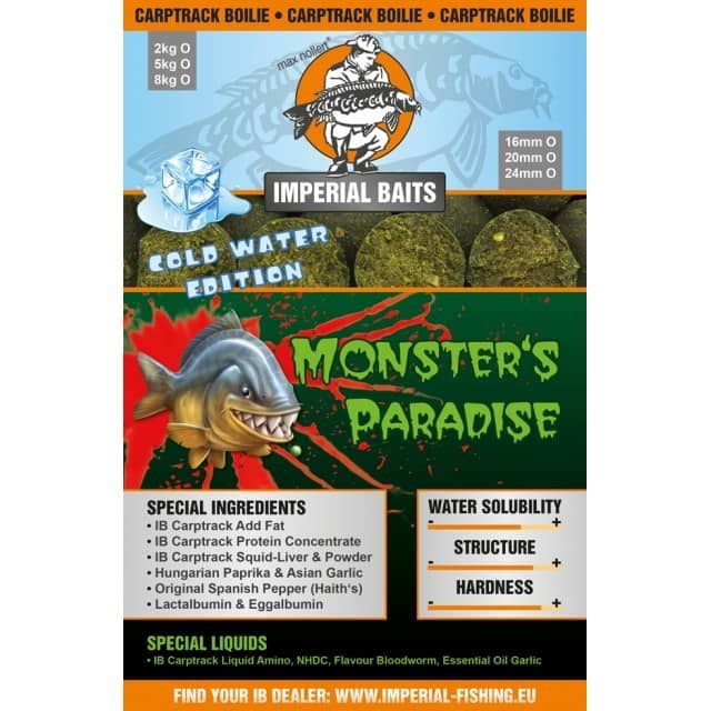 Základem tohoto boilie je už tolikkrát osvědčený mix Monster. Tento mix byl doplněn o Carptrack Powder, který zvyšuje jeho vábící účinnost a zároveň napomáhá jeho lepší stravitelnosti. Kromě toho ještě obsahuje 5% Maďarské papriky, Španělský pepř (Hait´s), který je ještě silnější než Robin Red, dále 2% asijského česnekového prášku a samozřejmě NHDC. Při výrobě boiliesu je přidáno do tekutých složek ještě na 1 kg mixu 5-7ml/kg esence Carptrack Bloodworm a 1ml/kg česnekového esenciální oleje. Toto způsobí, že se Vaše nástraha stane bombou, která mimořádně rychle rozvine svůj dlouhotrvající vábící účinek ve vodě. "Monstra" milují boilies Monsters Paradise.