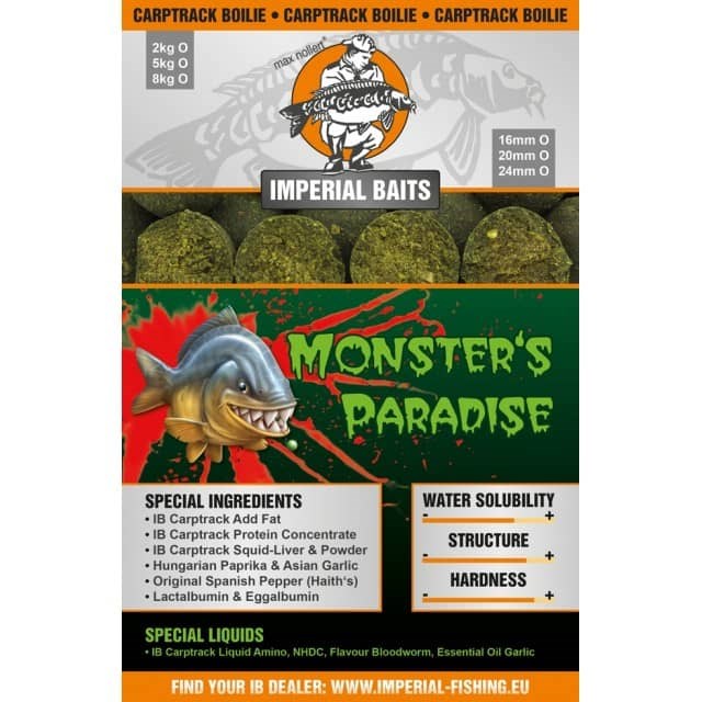 Základem tohoto boilie je už tolik krát osvědčený mix Monster. Tento mix byl doplněn o Carptrack Powder, který zvyšuje jeho vábící účinnost a zárověň napomáhá jeho lepší stravitelnosti. Kromě toho ještě obsahuje 5% Maďarské papriky, Španělský pepř (Hait´s), který je ještě silnější než Robin Red, dále 2% asijského česnekového prášku a samozřejmě NHDC. Při výrobě boiliesu je přidáno do tekutých složek ještě na 1 kg mixu 5-7ml/kg esence Carptrack Bloodworm a 1ml/kg česnekového esenciální oleje. Toto způsobí, že se Vaše nástraha stane bombou, která mimořádně rychle rozvine svůj dlouhotrvající vábící účinek ve vodě. „Monstra“ milují boilies Monster´s Paradise.
