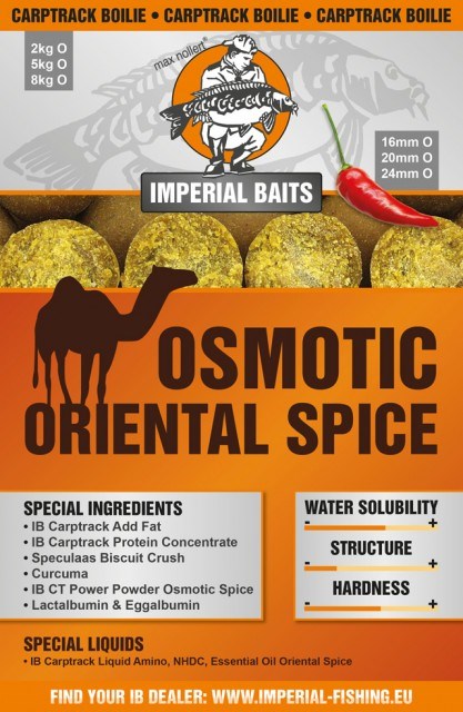 Díky použití vysoce atraktivní a ve vodě rozpustné moučky, se podařilo vytvořit tento výjimečný produkt. Na povrchu boiliesu hned po dopadu vrchní vrstva změkne a tím lépe pronikají atrakční látky do vodního sloupce. Osmotic Spice Boilies již od svého prvního testu ve vodě přináší nádherné úlovky rybářům!