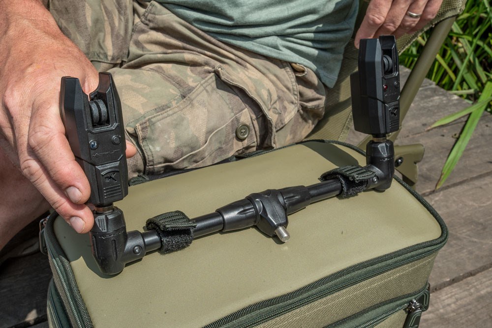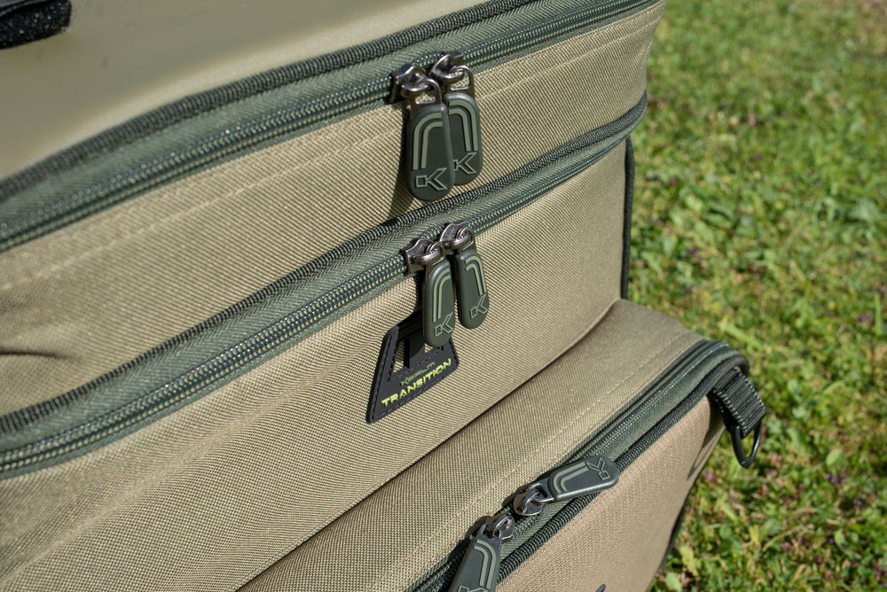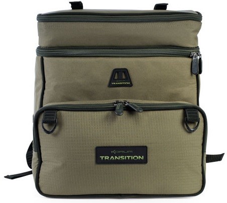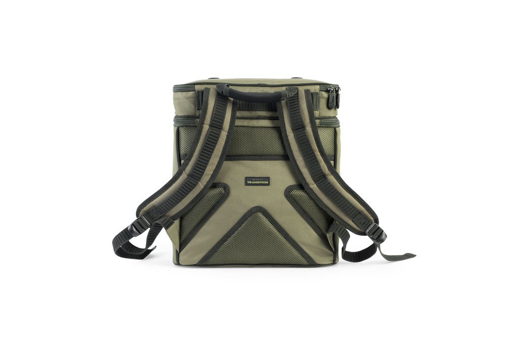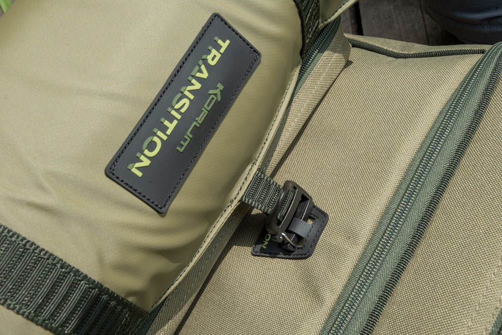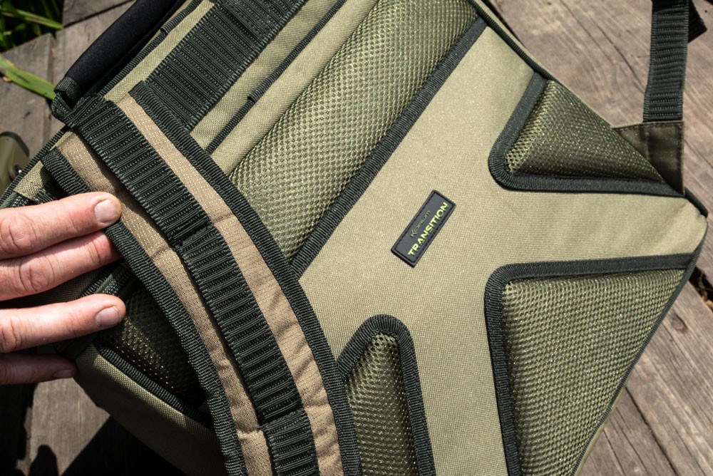 Zahrnuje oddělenou chladící kapsu v horní části na jídlo a návnadu a dva popruhy na suchý zip pro uložení věcí, jako jsou skládací sítě a tyče. K dispozici jsou také dvě D přezky určené pro připevnění karabinou a naše nové pouzdro Transition, které funguje ve spojení se všemi novými podložkami Transition. Přední kapsa kompatibilní s Transition doplňuje tuto kompaktní nabídku.