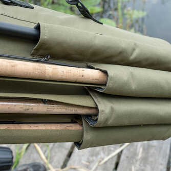 Do zadní přihrádku pouzdra se v klidu vejdou přístřešky nebo broly od značky Korum. Obsahuje také vnější kapsu na vidličky nebo přísluženství židlí.