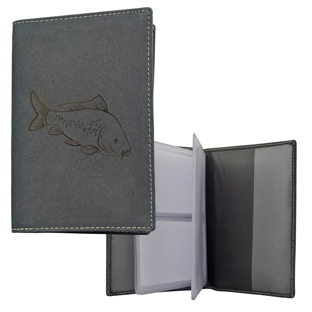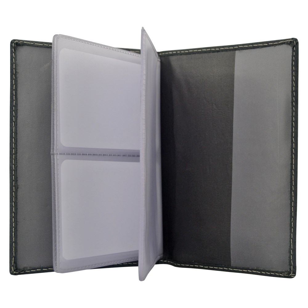 Kožené pouzdro na doklady, velikost 14x10cm, 4 průsvitné desky na doklady a 2 listy desek s 4 přihrádkami na karty.