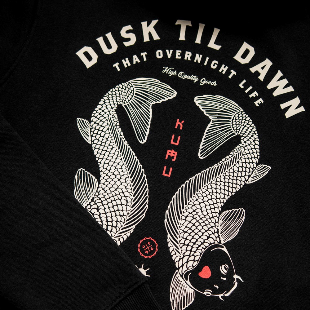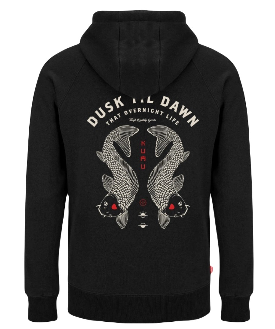 Po úspěchu našeho trička Dusk Til Dawn jste nás prosili, abychom tento motiv vydali také na mikině, takže tady je! Jeden pro noční posádku. Mikina pro ty, kteří milují lovit celý den a ani noční rybolov pro ně není překážkou! DUSK TILL DOWN v překladu znamená od úsvitu do soumraku.Ručně kreslená grafika v bílé a kontrastní červené. Vytištěno na naší luxusní látce 320 g/m2 s tkanými detaily na boční poutce.