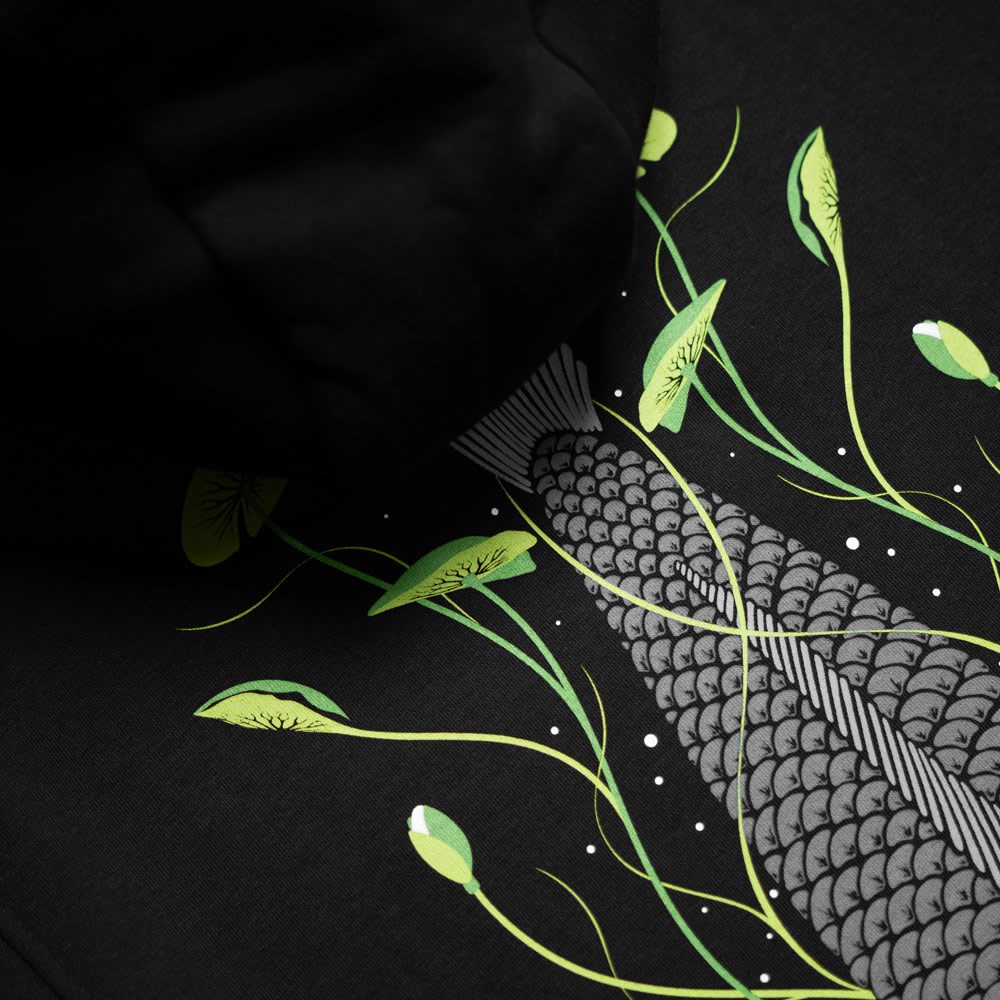 Když jste po nás volali, abychom vám vyrobili naši grafiku „Tails Up“ v podobě mikiny s kapucí, my jsme ji dodali. Ručně kreslená, u nás, od základu; naše grafika Tails Up zobrazuje kapra, který se živí mezi lekníny a vysílá oblaka bublin... něco, co dostane srdce každého závodícího rybáře. 5barevný sítotisk s tlumenými šedými odstíny a kontrastní zelenou na naší super měkké látce o gramáži 320 g/m2 s kontrastními konci šňůrek a tkanými detaily na boční straně.