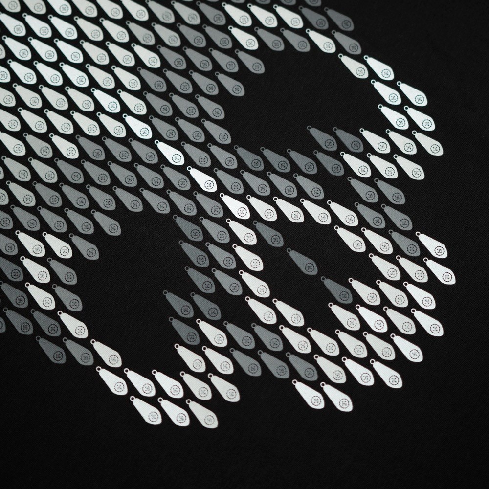 Pokud značku KUMU sledujete od samého začátku, možná si pamatujete tuto skvostnou grafiku z roku 2019. Nedávno jsme narazili na původní vzorek a cítíme, že si zaslouží oživení pro rok 2025. Použitím série chladných šedých tńů jsme vytvořili lebku s 3D gradientním efektem, vyrobenou z rybářských olov. Šestibarevný sítotisk na naší super měkké 150g/m2 látce s tkaným poutkem na boční straně.