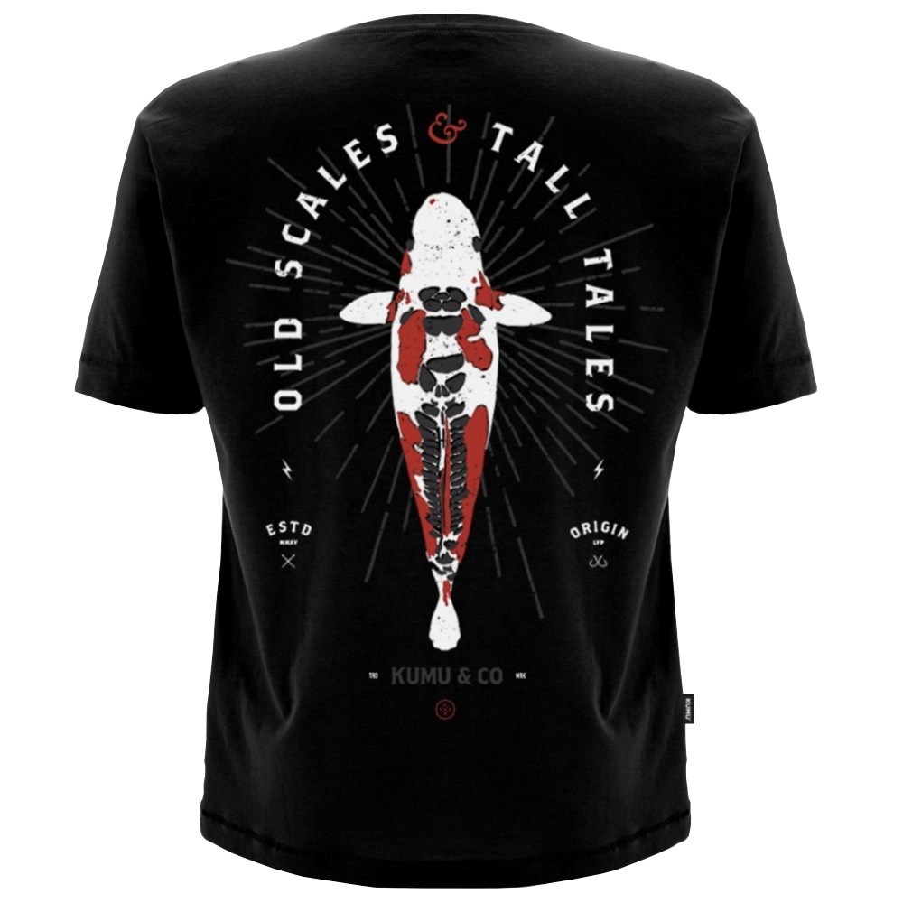 Old Scales & Tall Tales (staré šupiny & dlouhé příběhy). Další kousek, který nás znovu tvořivě žene novými směry a udržuje naše nápady svěží a vzrušující! Na přední straně s designem koi kapra na prsou a na zadní straně velký koi kapr s nápisy. Materiál 100% bavlna, 140gsm.