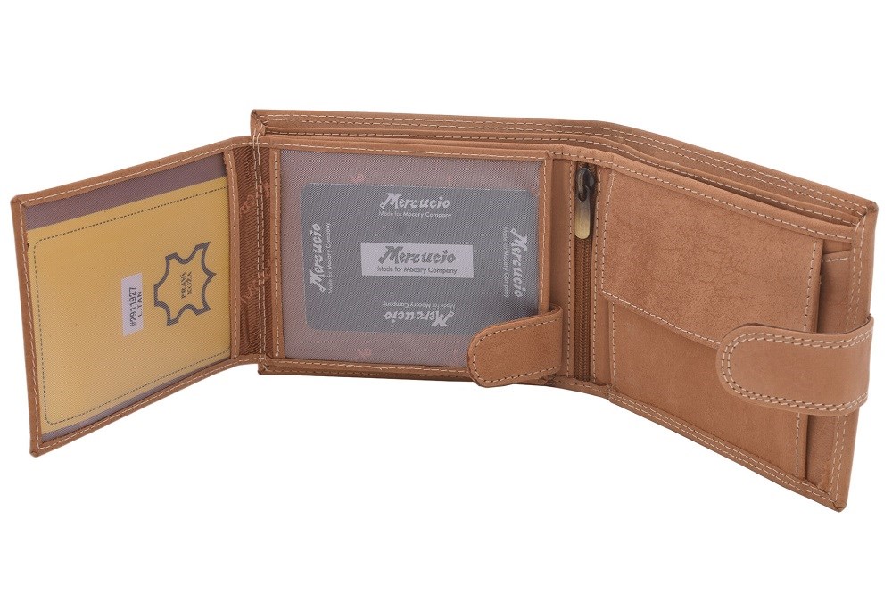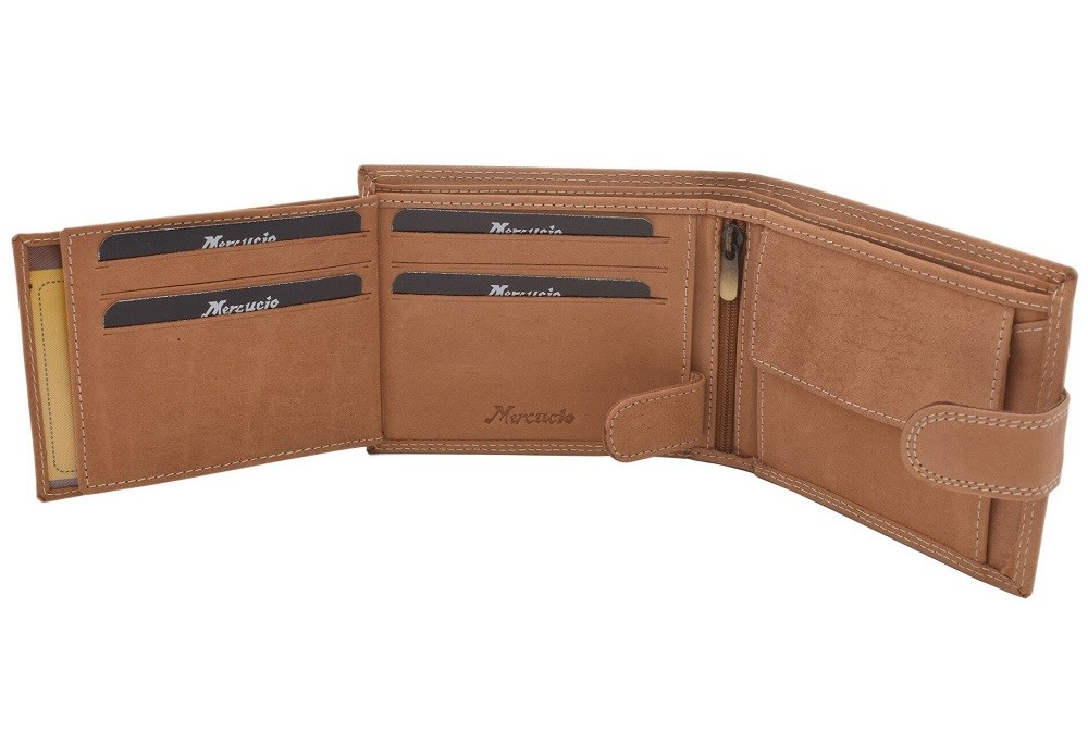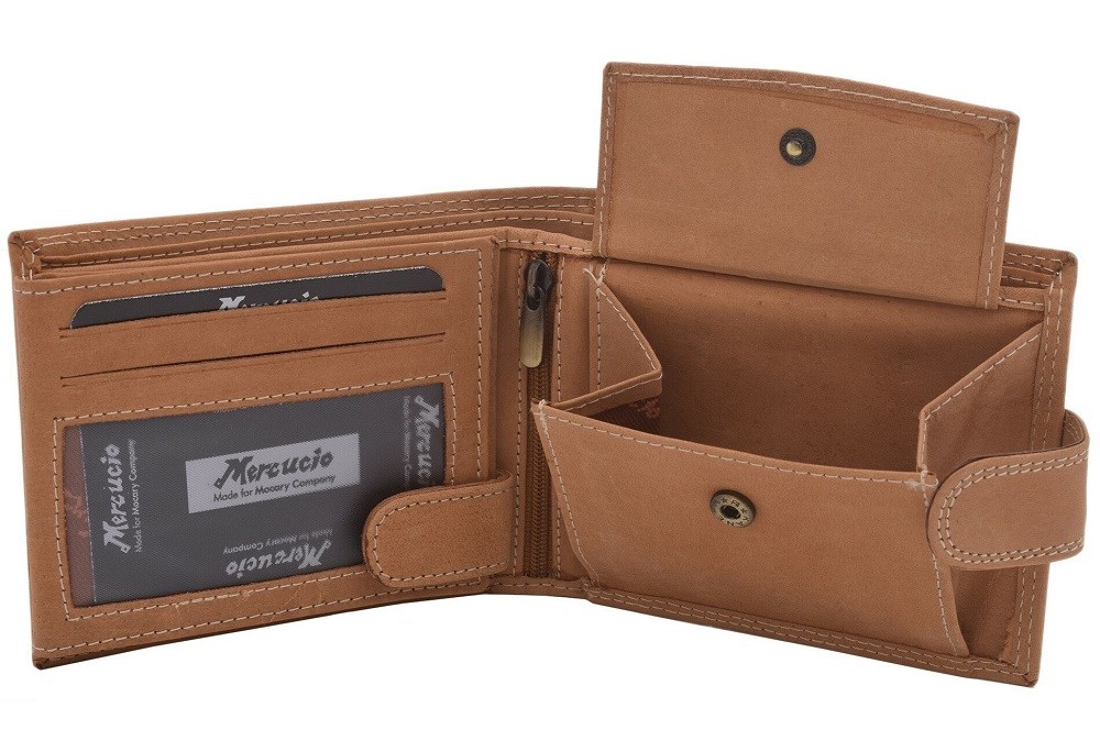 Peněženka z pravé kůže s vnějším zapínáním nabídne standardní praktičnost, kterou můžete najít při běžných peněženkách. Tento model pánské peněženky je orientován na šířku a obsahuje vnitřní zapínání. Výjimečnou črtou této peněženky jsou dvě přihrádky na bankovky.
