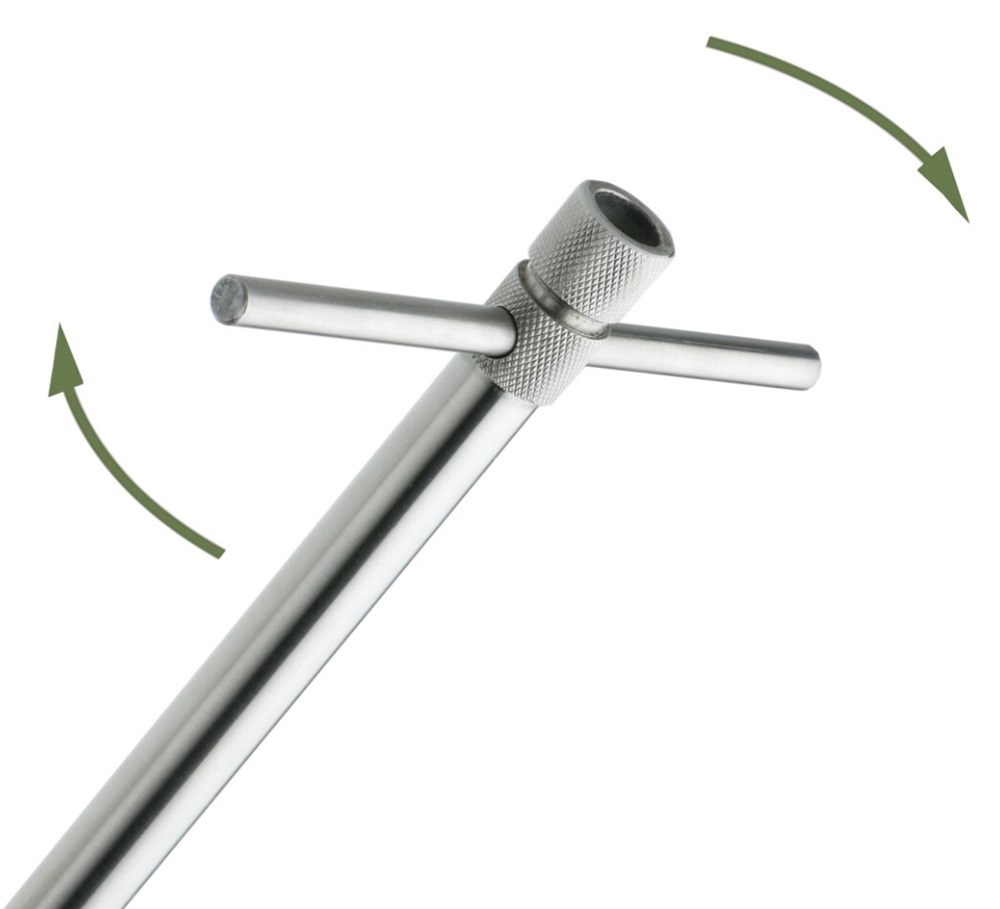 Rukojeť pro snadné zavrtání do země je součástí dodávky. Po vyjmutí vnitřní části lze do vidličky Hardcore XL zasunout kompletní vidličku Hardcore a získat tak třídílnou, mimořádně stabilní a dlouhou vidličku.