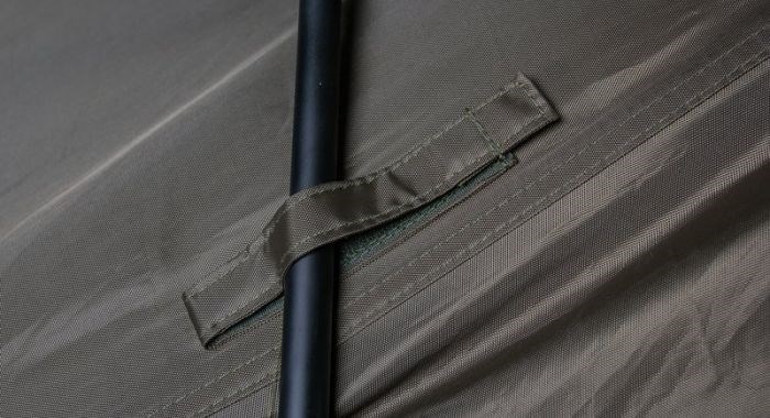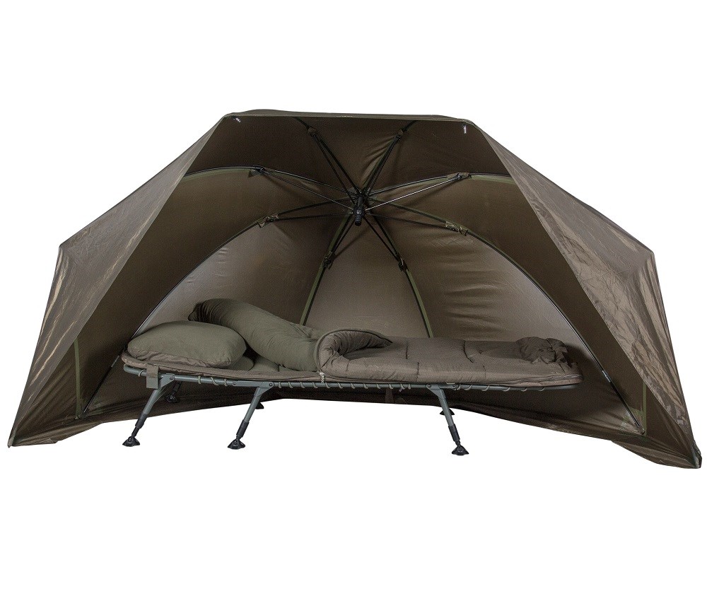 Osvědčený oválný design firmy Nash s rozšířenou boční částí. Upravená ramena konstrukce deštníku tak, aby poskytovaly více využitelného prostoru. Dostatek prostoru pro velké lehátko nebo dva rybáře na celý den u vody. Lehká konstrukce a kvalitně podlepené švy. Dva popruhy pro upevnění prutu. Dodáváno spolu s bouřkovými tyčemi a kotvícími kolíky.