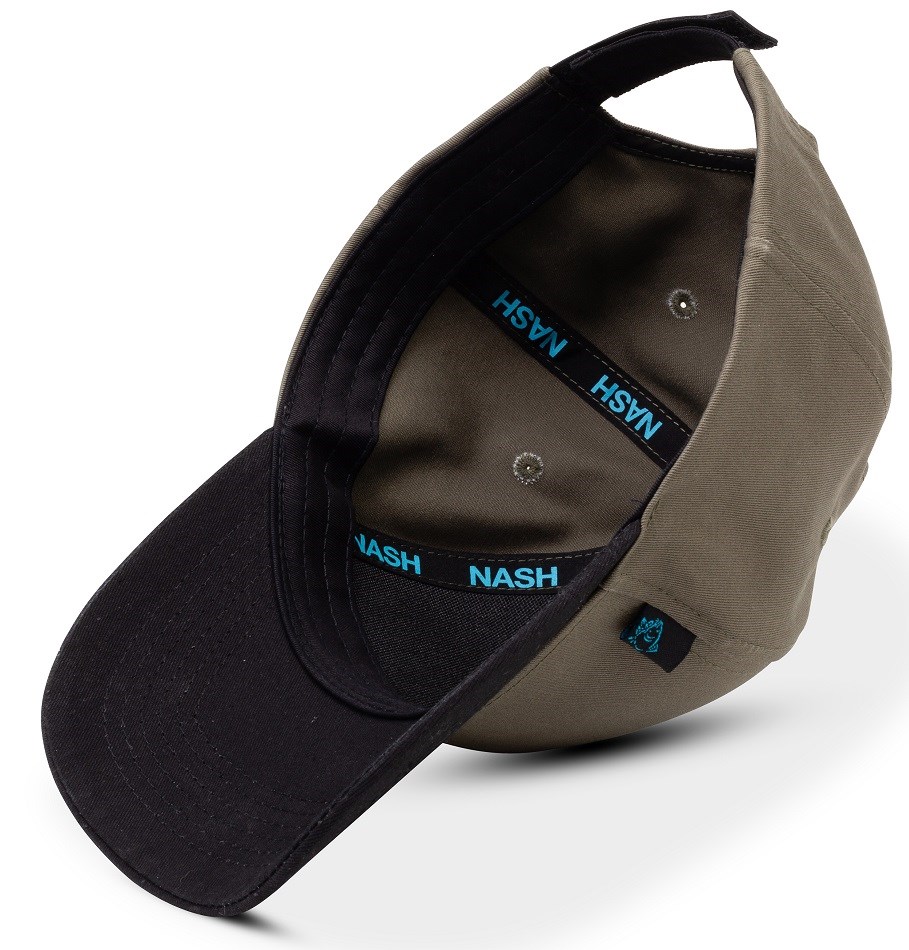 Na přední straně se nachází černé gumové logo Nash. Nabízí se ve dvou variantách - v černé a zelené barvě. Vrchní knoflík je v opačné barvě z každé varianty kšiltovky. Černá kšiltovka má černé gumové logo tyrkysovým nápisem Nash Tackle.