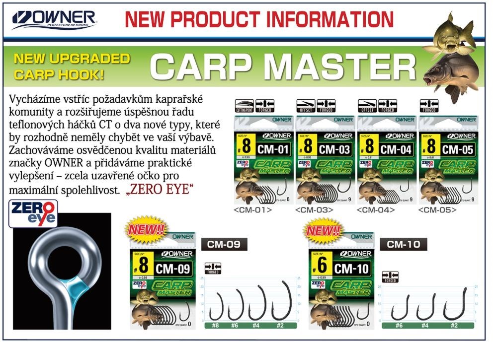 Řada háčků Owner CM-3 Carp Master jsou charakteristické teflonovým povlakem pro zvýšenou odolnost proti korozi.