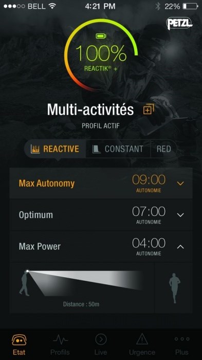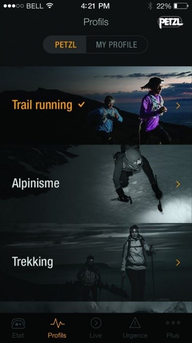 Díky aplikaci MyPetzl Light může uživatel kdykoliv přes svůj chytrý telefon kontrolovat stav akumulátoru a zbývající dobu svícení, upravovat nastavení výkonu a výdrže za pochodu, měnit režimy dle právě prováděné aktivity. Může si jednoduše stáhnout profily připravené pro trailrunning, mountaineering, trekking, kempování, nebo si může vytvořit vlastní profily dle potřeby.