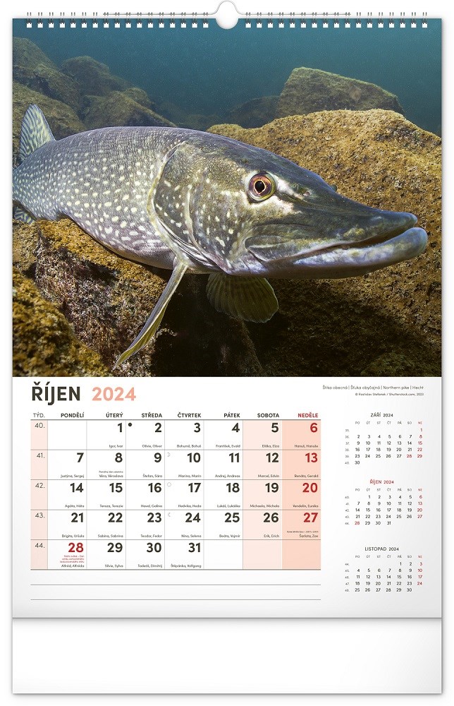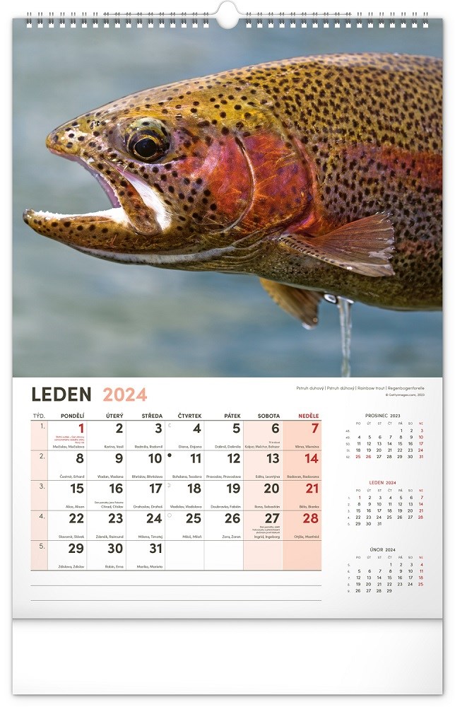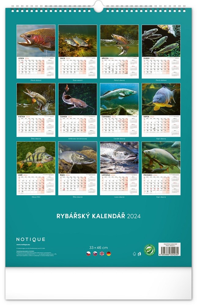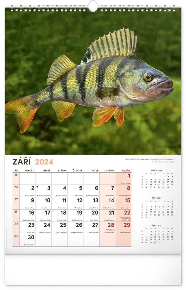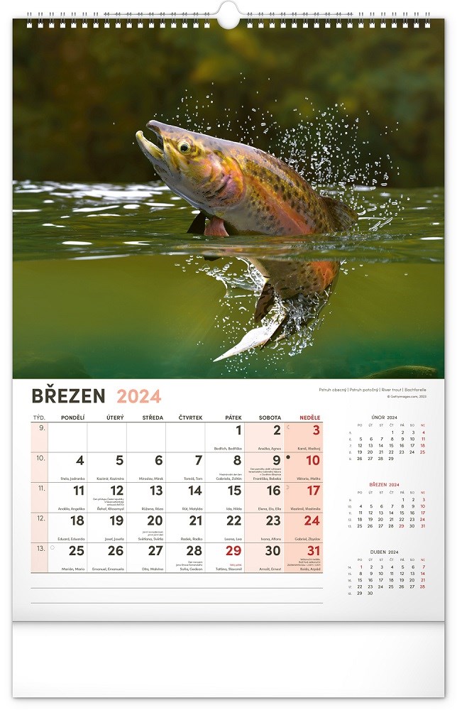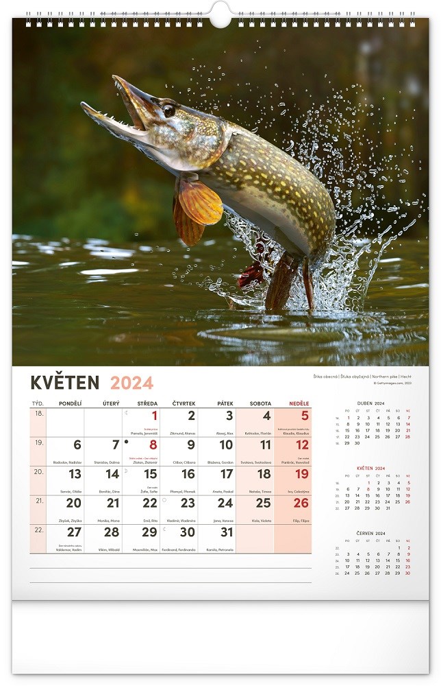 Nástěnný kalendář s fotografiemi z vodního světa zachycující ty nejskvostnější úlovky. Rozšířené kalendárium obsahuje česká jména, svátky a památné dny, tříměsíční přehled na každé straně a prostor pro poznámky. Nadchne všechny vášnivé rybáře a milovníky vodních toků.