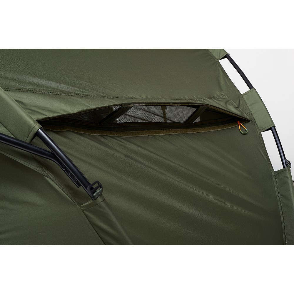 Konstrukce se 2 žebry vyústila v lehký a snadno postavitelný bivak. Obě verze jsou vybaveny předním kšiltem, který poskytuje zvýšenou ochranu při nepřízni počasí. Bivak disponuje systémem Pro-Vent – velký zadní větrací otvor a 2 přidané boční ventilační otvory zajišťují to nejlepší 360-stupňové větrání. To maximalizuje výměnu vzduchu, snižuje kondenzaci a zlepšuje výhled. Díky tomuto systému vám nebude příliš horko ani v teplých letních dnech! Odolná podlážka zabraňuje vniknutí hmyzu nebo vody a dá se snadno odejmout nebo opět připevnit pomocí suchého zipu. Bivak je vyroben z lehkého, ale extrémně odolného materiálu 210D (dvojitě potaženého) s vodním sloupcem 10 000 mm. Přední dveře jsou vybaveny síťovinovým oknem a dvířky se dvěma zipy, což umožňuje různé varianty otevírání a větší ochranu před rozmary počasí. Kondenzační přehoz dodávaný s 1 Man Bivvy a celý přehoz dodávaný s 2 Man Bivvy – oba jsou vyrobeny z materiálu 210D (dvojitě potaženého) s vodním sloupcem 10.000mm. Při použití poskytují vyšší komfort a umožňují bivaku efektivněji dýchat. Výměna vzduchu je však velice snížena, což vytváří skvělou termoizolační vrstvu, která pomáhá udržet teplý vzduch uvnitř bivaku a významně omezuje jeho ochlazování vlivem kontaktu s chladným vnějším vzduchem. To ve výsledku dramaticky snižuje vlhkost a tvorbu kondenzace. Tento systém lze dále optimalizovat při použití se systémem Pro-Vent tak, že větrací otvory zůstanou otevřené během teplého a mokrého období.