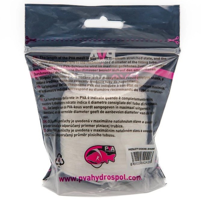 Náhradní PVA punčocha slouží k doplnění PVA materiálu na plnící tubus. Varianta 25 mm je pletená z 24 kvalitních PVA vláken, varianta 35 mm a 50 mm je pletená z 36 kvalitních PVA vláken.