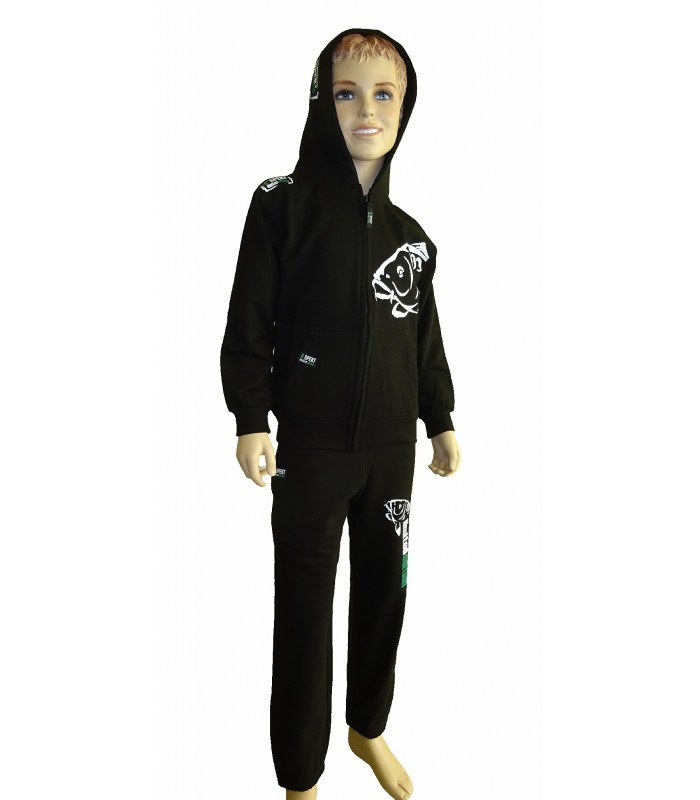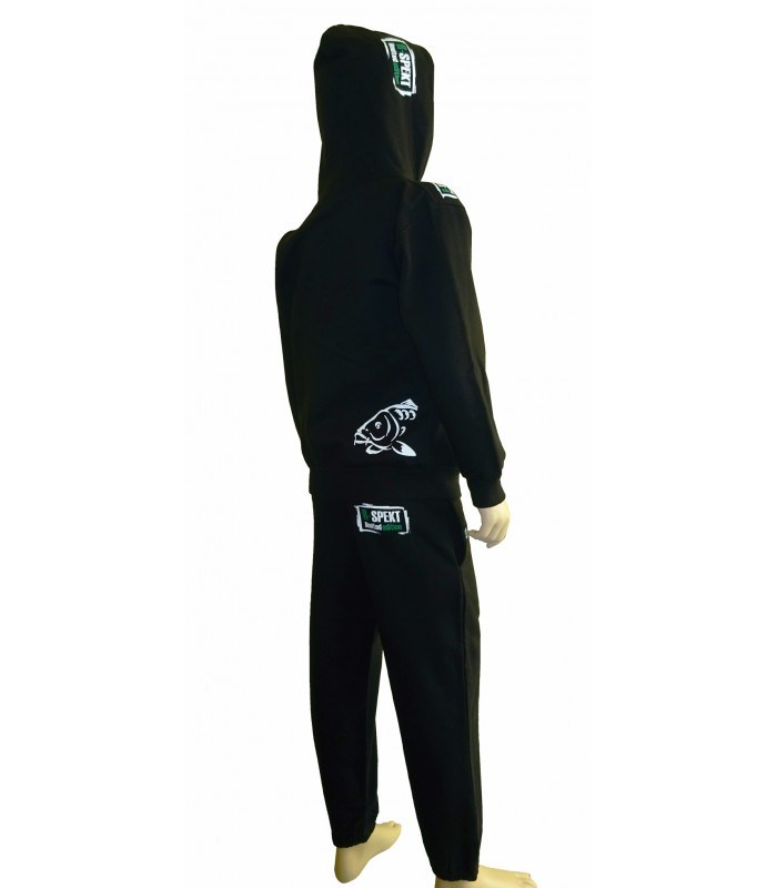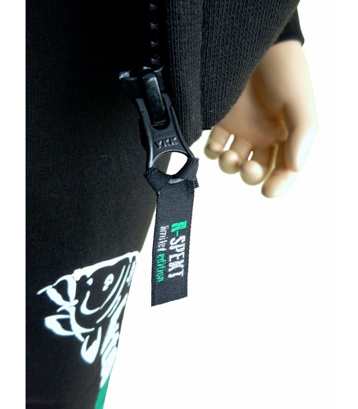 Dětská mikina nabízí rozepínání vpředu klasickým spirálovým zipem, čímž je docíleno maximální jednoduchosti a pohodlí při jejím oblékání. Mikina má také dvě boční klokaní kapsy a praktickou kapuci pro dokonalou ochranu hlavy. Pas a rukávy mikiny jsou zakončeny širokými pružnými náplety, které dokonale ochrání dětské tělo v chladnějším počasí. Tepláky mají v pase také široký pružný náplet, díky němuž nepadají dolů, dále dvě velké postranní kapsy a spodní lemy nohavic, které obepínají pružné gumy. Dětem udělá jistě také radost množství atraktivních tisků v podobě motivů kapra a log značky R-SPEKT limited edition na obou součástech této soupravy.