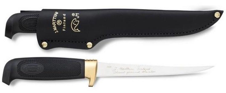 Délka čepele se nejlépe hodí na filetování ryb do 1 kg. Nůž má černou koženou pochvu.