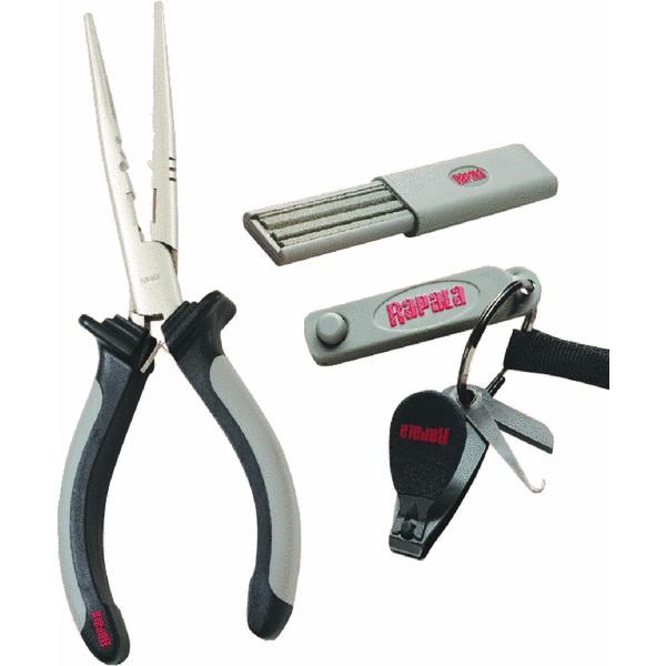 Souprava obsahuje rybářské kleště dlouhé 16cm, brousek na háčky, rybářské štípací kleště a samozřejmě popruh na krk.