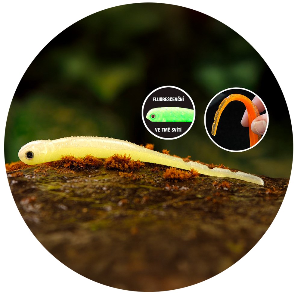 Ručně vyráběný extra měkký špičkový smáček, který ryba jen tak "nevyplivne" a díky použitému mimořádně měkkému materiálu se jej po záběru snaží polknout! Díky propracovaným povrchovým detailům těla (skřelové oblouky, rybí tlama apod.), 3D očím a vyzkoušenému tvaru by měl být nedílnou součástí vaší výbavy.