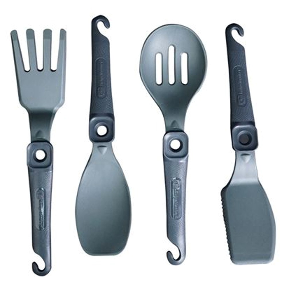 Sada náčiní RidgeMonkey Q-Lock je pevná a odolná proti opotřebení. Skládá se z vidličkové obracečky, špachtle s vroubkovaným okrajem, plné lžíce a lžíce s otvory.