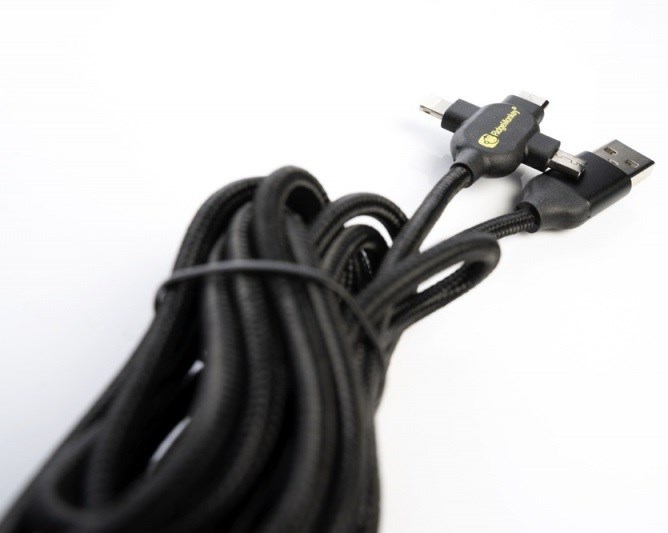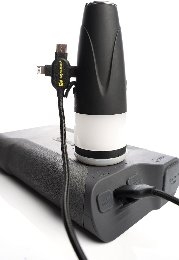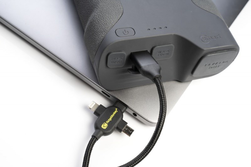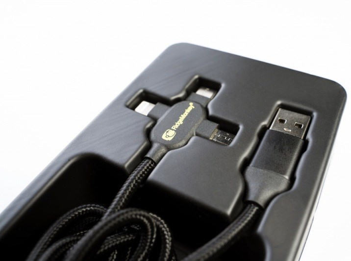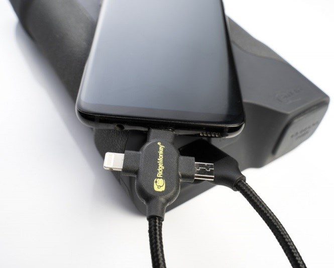 RidgeMonkey nabízí napájecí kabel o délce 100 cm. Kabelem má na konci tři konektory a můžete nabíjet až tři veci současně.